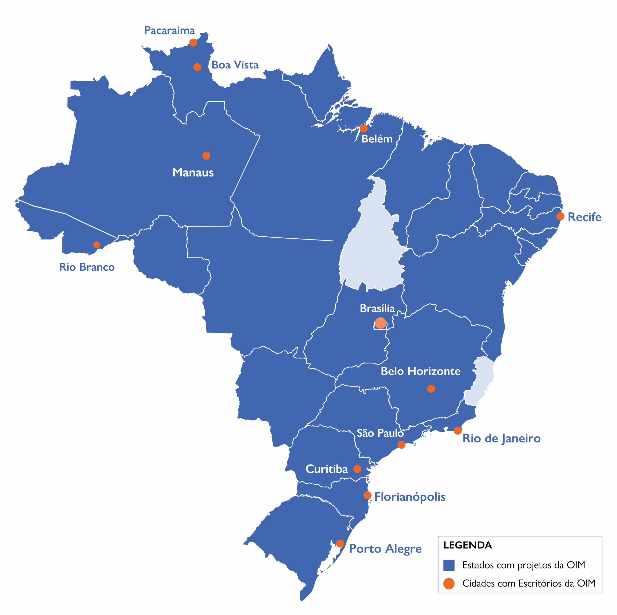 A OIM tem sua sede no País em Brasília e está presente em outras 12 cidades: Belém, Belo Horizonte, Boa Vista, Curitiba, Florianópolis, Manaus, Pacaraima, Porto Alegre, Recife, Rio Branco, Rio de Janeiro e São Paulo.